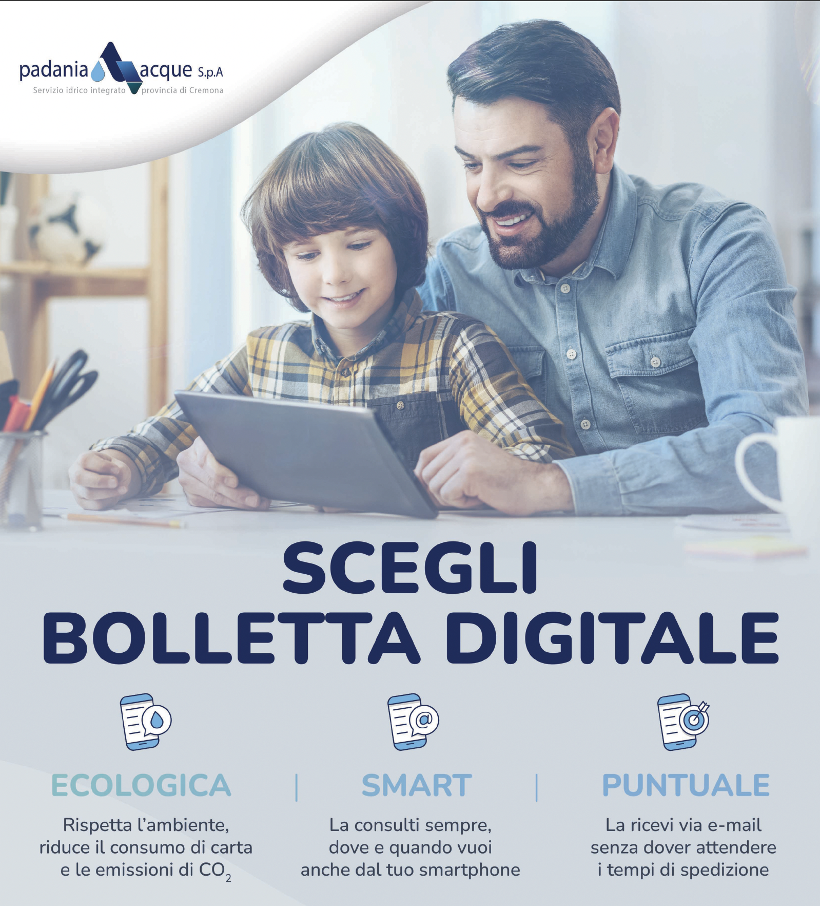 Con questo messaggio Padania Acque fornisce ai propri utenti tre ottime motivazioni per attivare gratuitamente il servizio di “bolletta digitale”, via e-mail con file pdf, anziché continuare a ricevere la fattura cartacea tramite spedizione postale.
