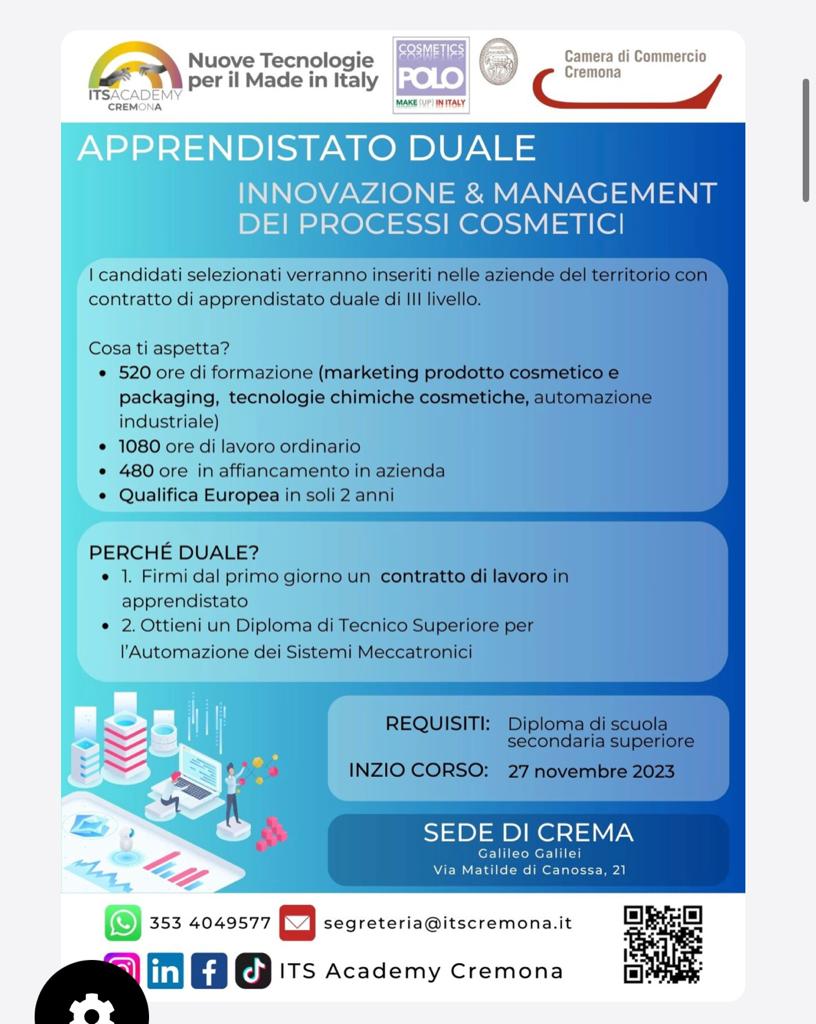 La curvatura del corso prevede un focus particolare sulle tecnologie chimico-cosmetiche e le esigenze di automazione dovute all’introduzione del modello “industria 4.0” nel settore PACKAGING; il corso prevede inoltre l’accento sul sistema qualità nelle aziende cosmetiche e la conoscenza delle specificità della relativa legislazione.